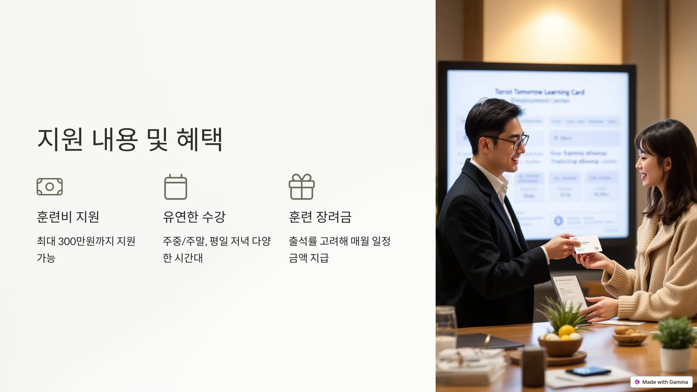 내일배움카드는 훈련비 지원부터 장려금까지 다양한 혜택을 제공합니다. 개인 상황에 맞춰 활용하면 교육 비용 부담을 크게 줄일 수 있습니다.
