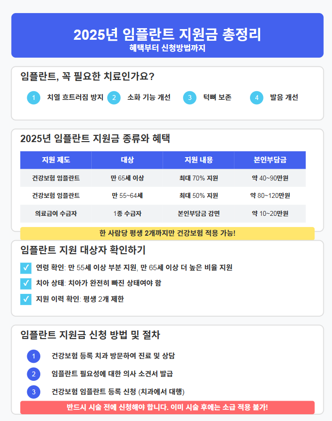 기초생활수급자와 차상위계층을 위한 의료급여 임플란트 지원은 본인부담금이 1종은 5%, 2종은 15%에 불과합니다. 2025년부터는 연령제한이 완화되어 만 60세 이상부터 신청 가능하니, 해당되시는 분들은 주민센터나 보건소에서 꼭 확인해보세요.